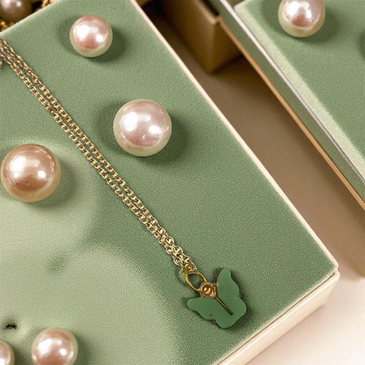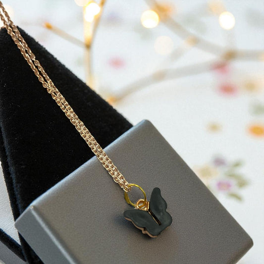 Gold-plated necklace featuring a black acrylic butterfly pendant